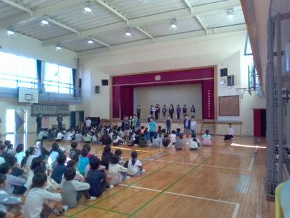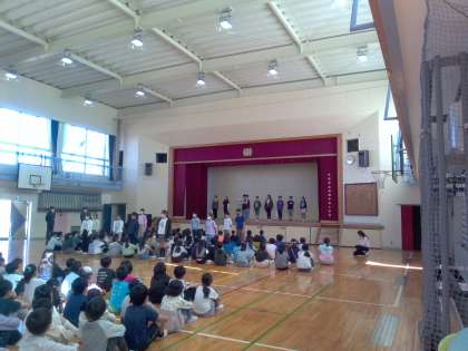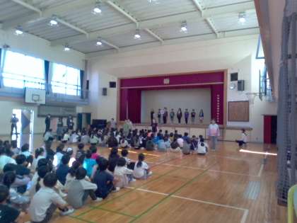 全校の子どもたちの前に立って挨拶をしました。