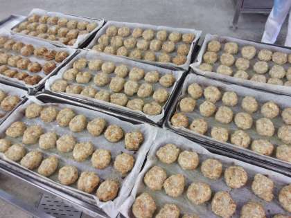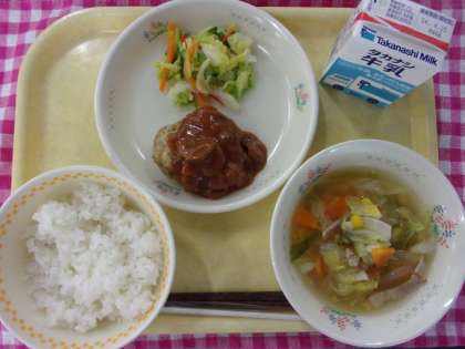 今日の給食は、ご飯・ハンバーグケチャップソース・カラフルサラダ・麦入り野菜スープです。今日のハンバーグは、1つ1つ丁寧に形を作っています。ハンバーグの生地に豆腐を入れているので、やわらかく仕上がりました。