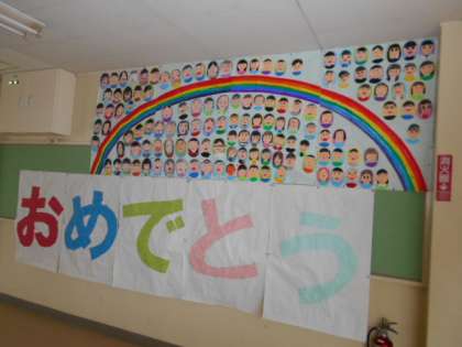 1階廊下には、「おめでとう」の文字と似顔絵があります。