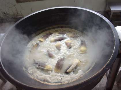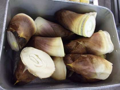 明日の給食で使用するたけのこです。給食で使用する野菜は基本的に当日納品ですが、たけのこは下処理が必要なので、前日に納品します。皮付きのたけのこは、とうがらしと糠を入れたお湯で煮て、あく抜きをしておきます。その後皮をむいて切り、調理します。旬のたけのこの味を、ぜひ子どもたちに味わってもらいたいです。