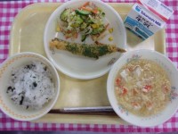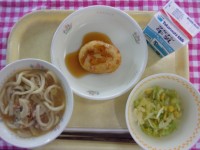 スパニッシュオムレツは、スペイン料理のひとつでじゃがいもとたまねぎを炒め、塩で味付けした卵と混ぜてフライパンで焼いたたまご料理です。給食では、じゃがいもと玉ねぎを炒めてから、たまごと牛乳・チーズを混ぜ、鉄板に流し焼いてから切り分けました。スペインのオムレツを味わってください。