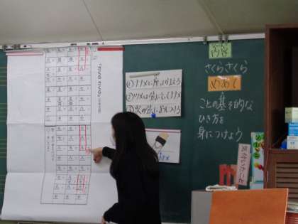 「日本の音楽でつながろう」という学習です。4年生は箏に挑戦しています。今日は、箏の楽譜の読み方や弦について復習したあと、グループに1面の箏を準備しました。箏を弾くときの約束事も確認し、「さくらさくら」の第1段を唱歌(しょうが)を口ずさみながらグループ練習です。それぞれ役割があり、アドバイスをし合います。最後は、先生が伴奏を付けながら、順番にまとめの演奏をしました。