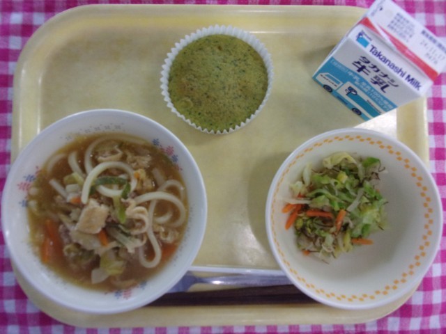 今日の給食は、牛乳・白ごまタンタンうどん・和風サラダ・小松菜ケーキです。