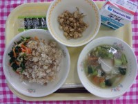 今日の給食は、牛乳・ビビンバ・きなこ豆・ふんわり卵スープです。きなこ豆は、大豆を...