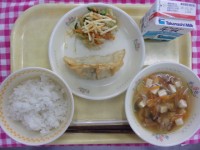 10月21日の給食は、牛乳・ご飯・ジャンボ餃子・じゃがいも入りナムル・春雨スープ...