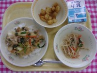 今日の給食は、牛乳、麦ご飯、生揚げのそぼろ煮、三色ナムル、りんご、です。