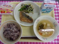3月10日(火)の給食は、牛乳、お赤飯、さばの竜田揚げ、磯香和え、お祝い汁、お楽...