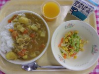 今日の給食は、牛乳、チキンカレーライス、キャベツとコーンのサラダ、オレンジゼリー...