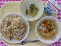 今日の給食は、牛乳・衣笠丼・白菜の塩昆布漬け・手まり麩入りすまし汁です。今月の郷土料理は、京都府のメニューです。京都の金閣寺近くにある「衣笠山」に由来した名前の丼ものです。油揚げとねぎを卵でとじた見か...