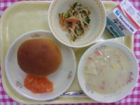 今日の給食は、牛乳・ミルクパン・手作りりんごジャム・茎わかめ入りサラダ・コーンチャウダーです。手作りりんごジャムには、りんごの他にもパイナップルや人参ペーストが入っています。鉄の大釜で作ると、鉄分と反...