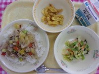 今日の給食は牛乳、コロコロ根菜ガッパオライス、こまツナレモンサラダ、じゃが揚げカレー風味です。町田市をホームタウンとしているサッカーチーム「FC町田ゼルビア」の選手の皆さんが実際にクラブハウスで食べて...