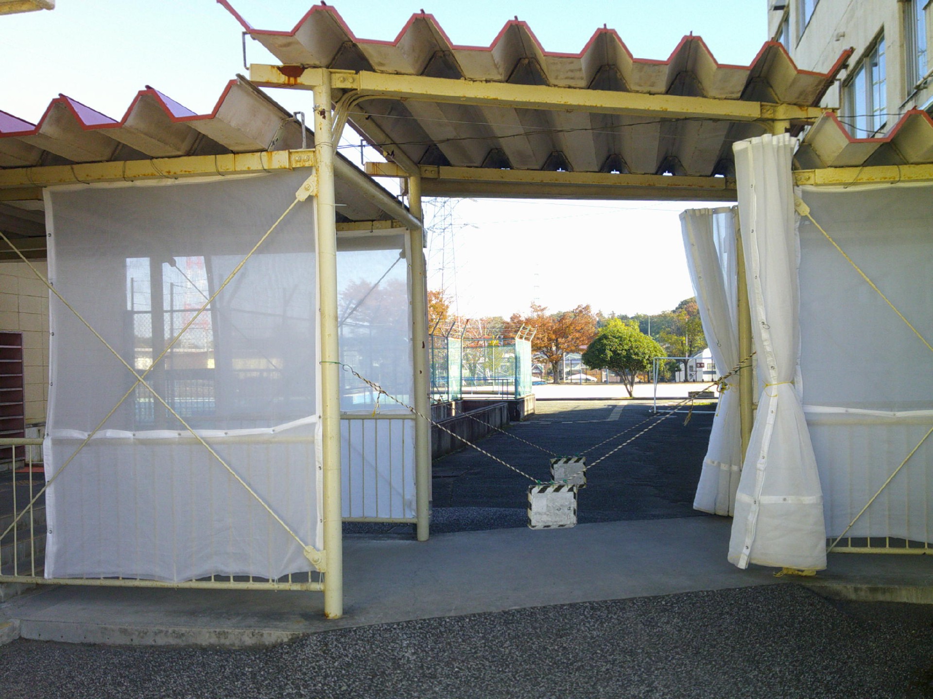 用務主事さんに渡り廊下の雨よけを取り付けてもらいました。