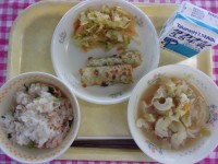 今日の給食は、牛乳、桜おこわ、さばの西京焼き、磯和え、すまし汁、です。今日から1学期の給食が始まります。(2年生から6年生)1年生の給食は4月13日(月)から始まります。