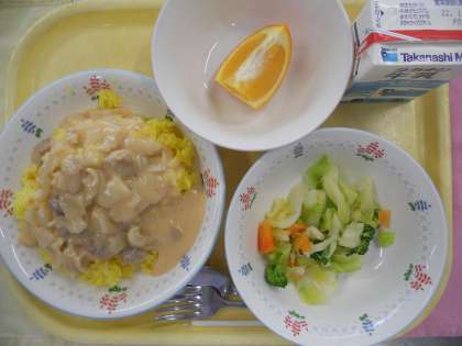 きょうの主食は、ターメリックライスの上に、とり肉の入ったクリームソースをかけます。よくかんで食べましょう。