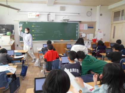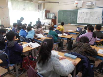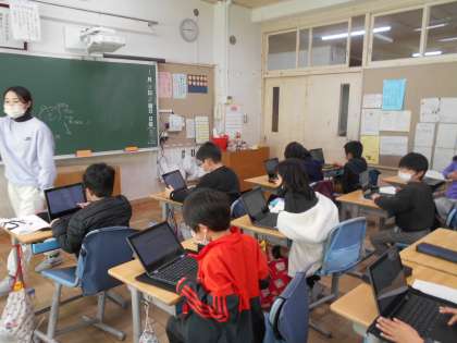 それぞれの教室でクロームブックや教科書を使って勉強していました。