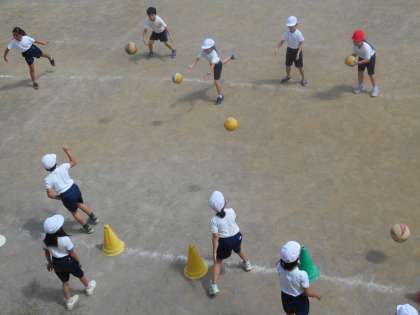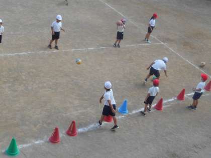 コーナーポストに向けてボールを転がしたり、投げたりしていました。