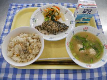 今日のメニュー…牛乳、里いもごはん、さばの南部焼き、野菜のこんぶあえ、かぶのすりながし汁