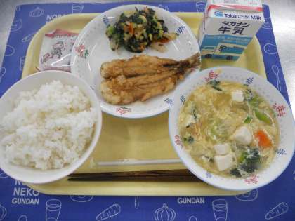 今日のメニュー…牛乳、ごはん、いわしのかばやき、いそかあえ、かきたまじる 福豆(あとひきみそだいず)