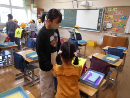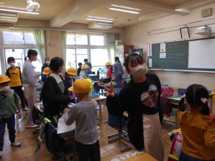 今日も6年生が教室で1年生の朝の支度のお手伝いをしていました。