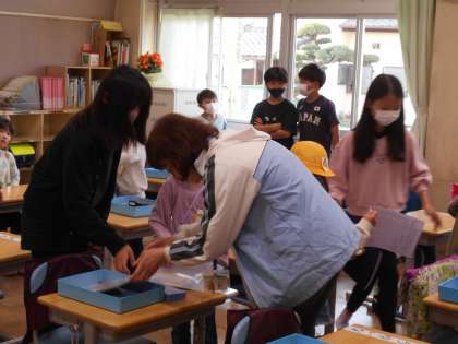 今日も6年生が教室で1年生の朝の支度のお手伝いをしていました。