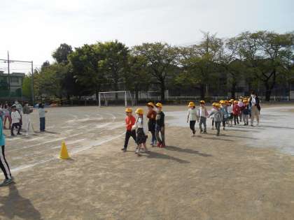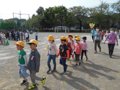 全校児童が校庭に集まって「1年生との対面式」を行いました。