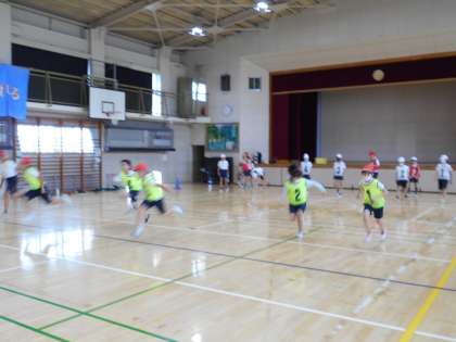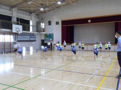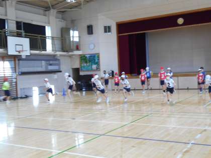 雨が降っていたので、体育館でバトンパスの練習をしました。