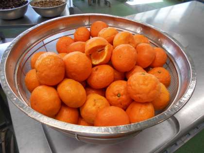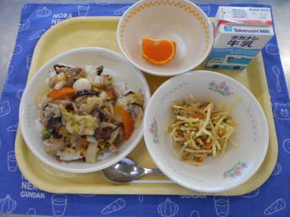 今日のメニュー…牛乳、中華丼、ポテト入りナムル、カラマンダリン
