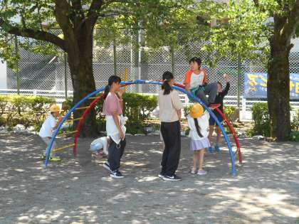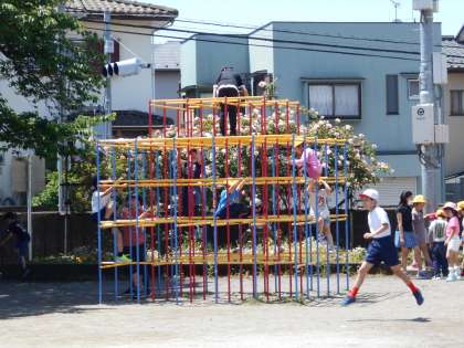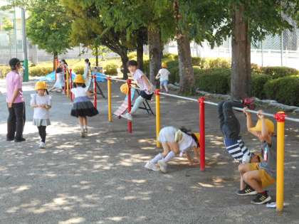 鉄棒やジャングルジムで遊んでいる児童もたくさんいます。