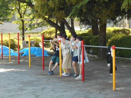 鉄棒やジャングルジムで遊んでいる児童もたくさんいます。