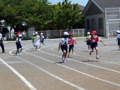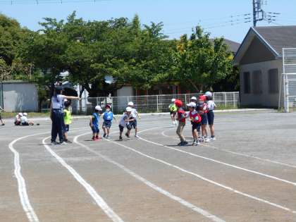 校庭の真ん中では、低学年リレーの練習が行われていました。