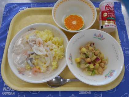 今日のメニュー…ジョア(ストロベリー味)、ターメリックライス、えびクリームソース、さつまめサラダ、菊花みかん