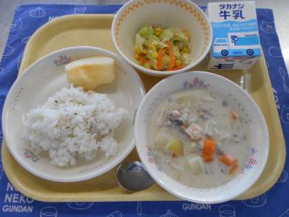 今日のメニュー…牛乳、パセリライス、3びきのくまのシチュー、キャベツとコーンのサラダ、くだもの(りんご)