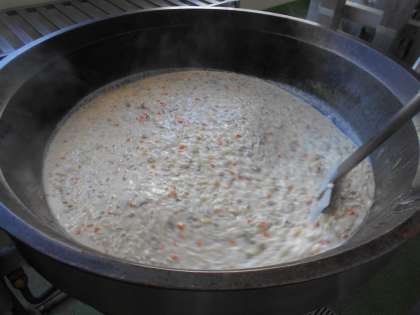 給食では麦を入れたシチューを作り、くまが作った料理を再現してみました。