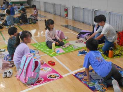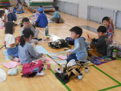 1年生と2年生は体育館で一緒にお弁当を食べました。
