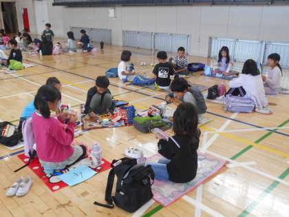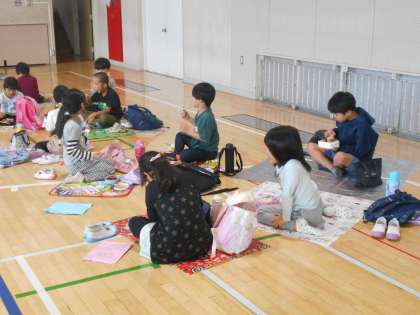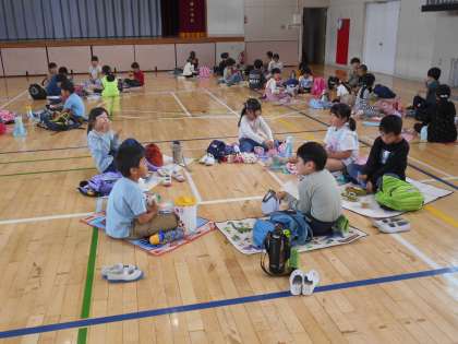 1年生と2年生は体育館で一緒にお弁当を食べました。