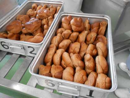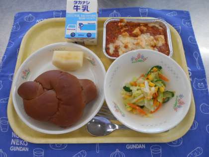 今日のメニュー…牛乳、ココアパン、豆腐のミートソースグラタン、ボイルサラダ、リンゴ
