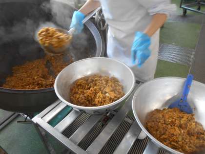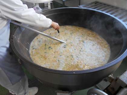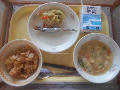 今日のメニュー…牛乳、キムチチャーハン、焼きししゃも、からし和え、かきたま汁