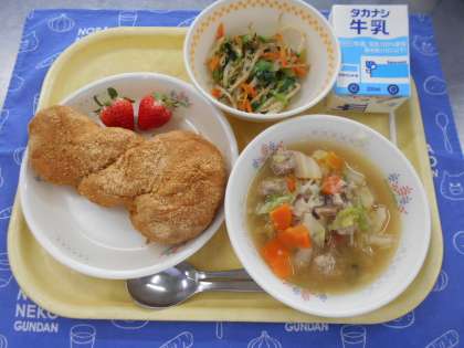 今日のメニュー…牛乳、きなこ揚げパン、白菜と肉団子のスープ、野菜のからし和え、いちご