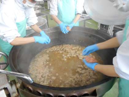 ねじりパンを給食室でさっと揚げて、きなこ、さとう、少しの塩をまぜた粉をまぶしています。