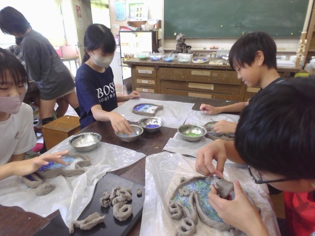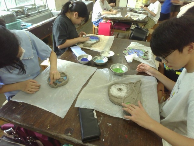 いよいよ陶芸も大詰めです。陶芸にガラス粒を入れて、本日窯入れを行いました。1230度の本焼きを行います。一回窯入れを行うと、焼成から冷やしまで4日ほどかかるので、今週末に焼き上がりを確認します。