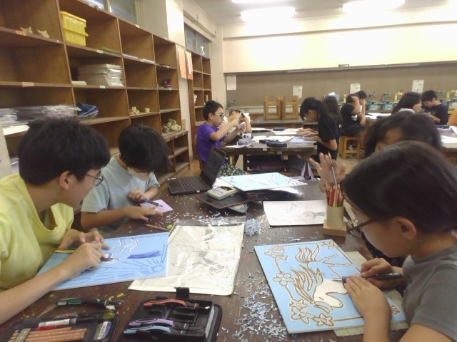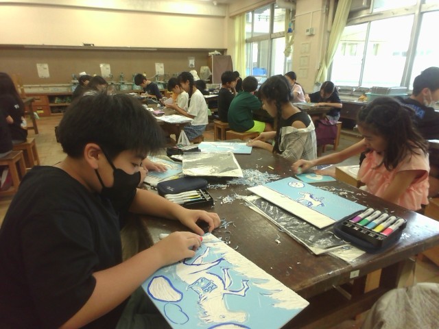 いよいよ干支版画の彫り終わりに近づいてきました。彫刻刀は、図工の授業の中でも最もケガの多い道具です。毎回、黒板で持ち方の確認と安全指導を行い作業を進めています。はじめて使う児童も多く、余計な力が入ってしまい指先や腕が疲れやすいため、適宜休憩を取りつつ、安全に気を付けて彫ることができました。次回は、試し刷りを行う人もいます。版画の醍醐味は、刷った時です。思ったようにいかなくても、面白い表現ができたりすることもあります。来週が楽しみです。