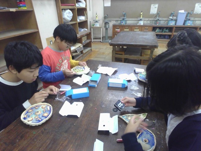 陶板時計ができあがりました。「色が薄くなったきがする!」「過去最高作品だ!」「つるつるだ!」など、それぞれが感想を言いながら作品を陶芸室から教室まで運び、時計の針を取り付けました。