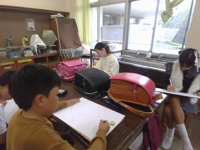 時計が完成したあとは「ランドセルを描こう」のつづきをしました。細かい箇所をよく観察して下書きをした後は、名前ペンでなぞります。そして、そのあとに着色を行う予定です。