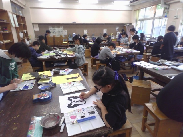 1クラスは、5年生の図工です。5年生はアボリジニアートのつづきをしています。ひたすら点々を描いています。点描画とは違い、点は重ねることなく、少し隙間をあけながら川や海、森などの表現を行っています。次回でこのクラスは最終回となります。