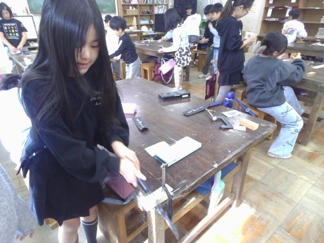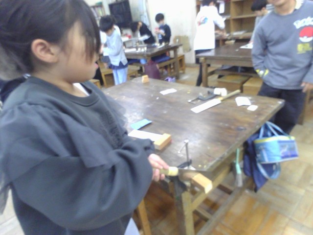 もう1クラスは、4年生の図工です。4年生は、くぎにんげんちゃんをつくっています。最初は木を切る作業です。のこぎりをはじめてつかう子もいるので、安全指導を行い、クランプで木を止めて作業しました。木工作のあとの図工室は木材の香りに包まれ、森林浴をしているような気分になります。