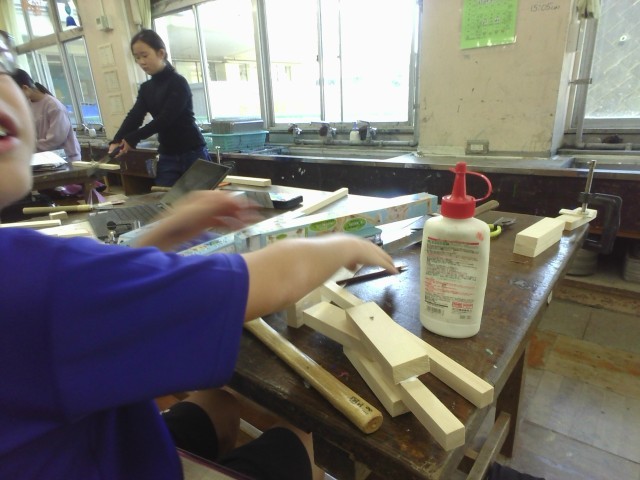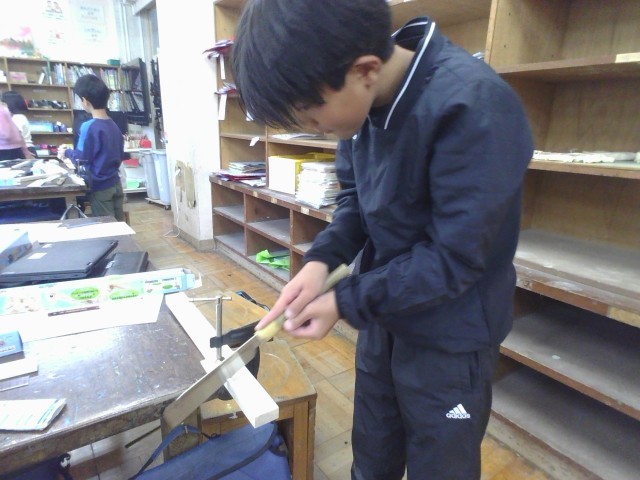 一クラスは、木工作「とんぎこどうぶつえん」に入りました。前回の題材でのこぎり・釘打ちをマスターしたので、その応用として木材を切り出して組み合わせる作業をしています。