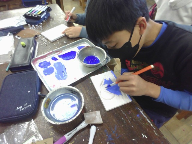 2月10日(火)図工の様子 公開日 2026/02/10 更新日 2026/02/10 学校日記 6年生の図工です。卒業制作のつづきです。彫刻刀でレリーフを彫り、アクリル絵の具で彩色を行いました。 6年 専科 学校日誌