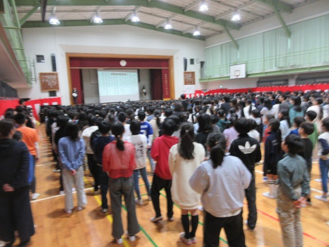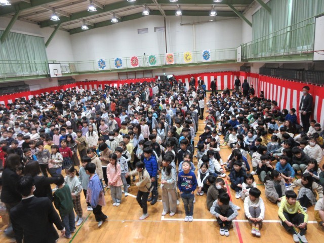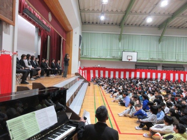 全校児童が体育館に集まり、去られる先生方のお話をお聞きました。