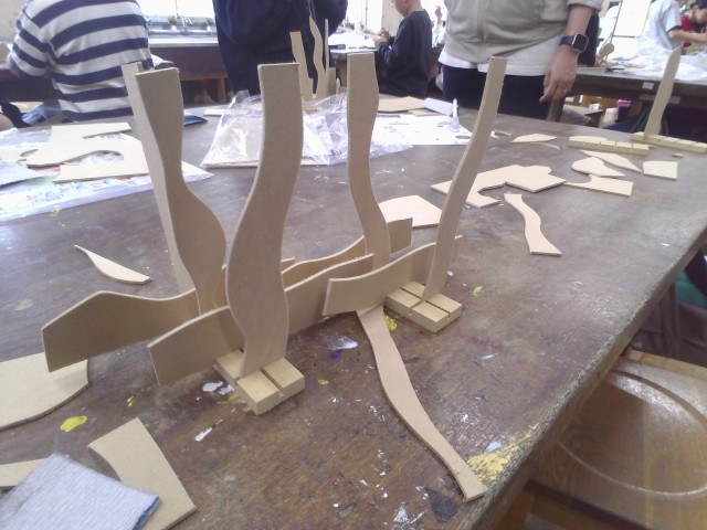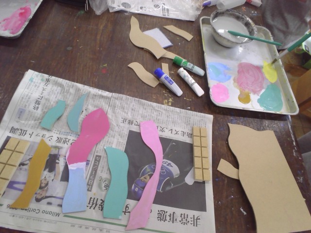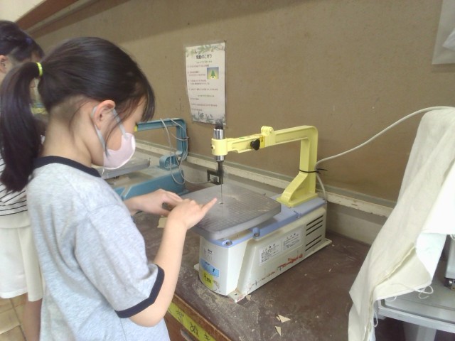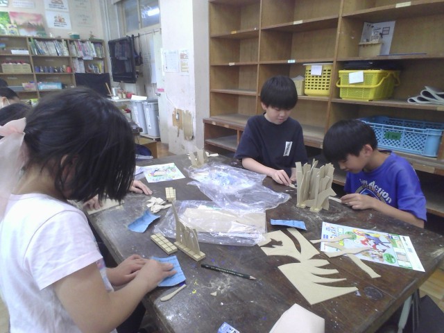 先日の図工に引き続き、電動のこぎりを使い木材を切り出しました。組み合わせ方は千差万別なので、それぞれが組み合わせ方を考えていました。そのあとは、色塗りをしていきます。作りたい生き物に合う色を決めて、着色することができました。