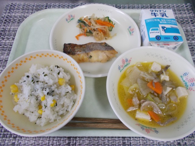 菜の花ごはん 魚の香味焼き 甘酢あえ 豚汁じる 牛乳
